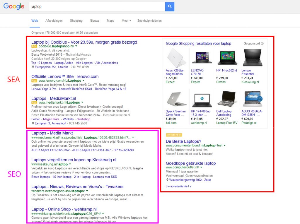 In de afbeelding hieronder zie je een voorbeeld van het zoekresultaat op het woord ‘laptop’ in Google. In het rode kader bovenin worden de betaalde SEA-resultaten getoond en daaronder de onbetaalde SEO-resultaten (ook wel organische zoekresultaten genoemd).